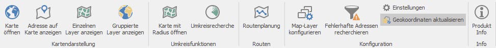 Nachdem die Feldzuordnungen konfiguriert wurden, können nun die Adressen aus der cobra Datenbank in Geokoordinaten umgewandelt werden. Klicken Sie hierzu in dem MAP+PLUS Reiter auf den Menüpunkt Geokoordinaten aktualisieren.