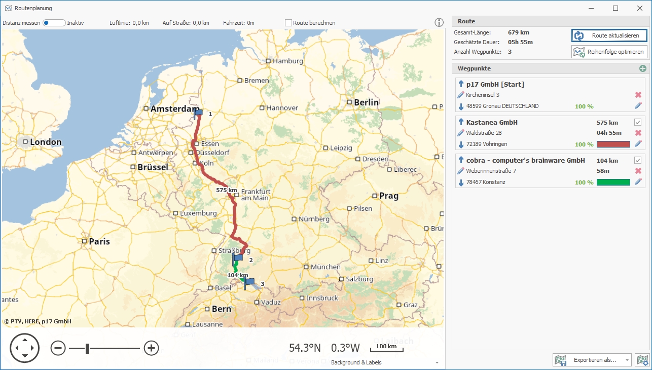 Mit der Routenplanung in MAP+PLUS können Sie eine Route mit bis zu 80 Wegepunkten berechnen. Die Route kann dabei in dem Dialogfenster verändert werden.
