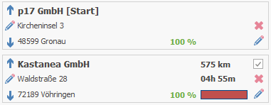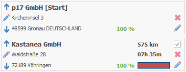 Außerdem wird in der Routenplanung je nach Fahrzeugprofil die Kilometeranzahl, sowie die Fahrtzeit angepasst. In den zwei folgenden Abbildungen sind die Fahrzeiten und die Fahrstrecken für die Fahrzeugprofile Auto und LKW mit 40t gegenübergestellt. Es ist zu erkennen, dass das Auto die Strecke der 575 km von der p17 GmbH zur Kastanea GmbH in einer Zeit von 04h 55m zurücklegt. Andererseits wird die Fahrtzeit für den LKW 40t mit 07h 34m berechnet. Die Berechnung der Fahrtzeit und Fahrtstrecke wird somit ebenfalls an das jeweilige Fahrzeitprofil und der einzubeziehenden Restriktionen berechnet.