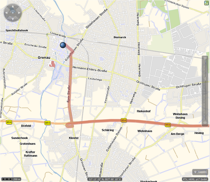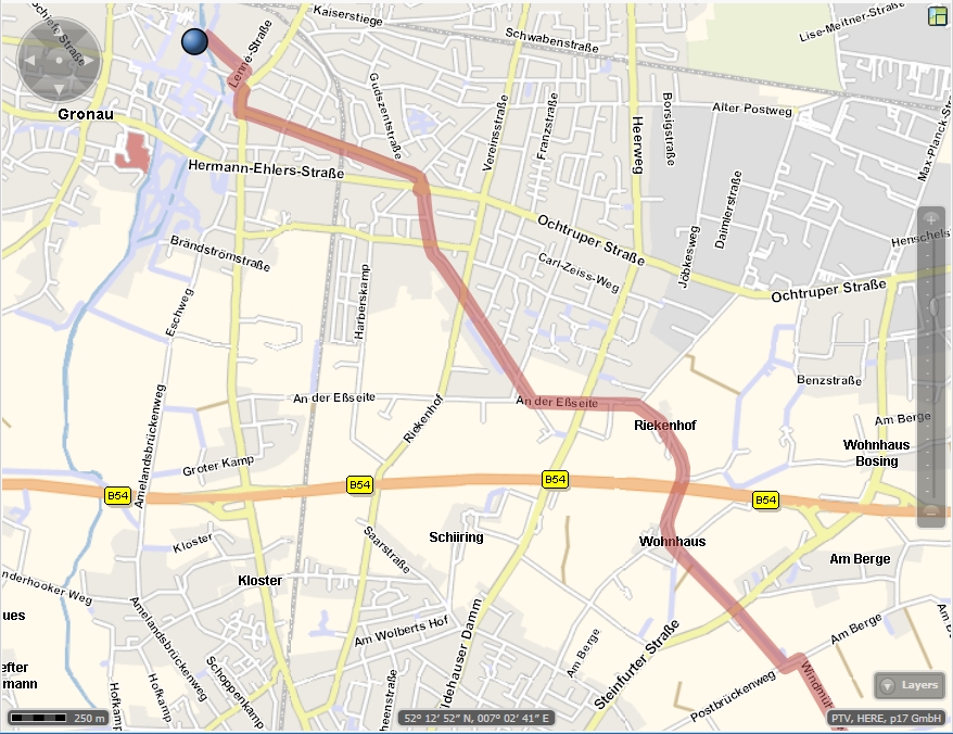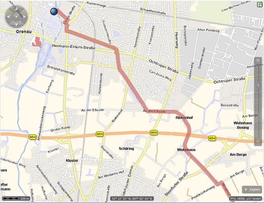 Bei der Wahl des Fahrzeugprofils Auto wird die Route ausgehend der p17 GmbH über die B54 geplant. Die Bundesstraße B54 enthält somit die Restriktion, dass diese für Fahrradfahrer und Fußgänger verboten ist. Entsprechend wird die Route über eine Landstraße, wie in der Abbildung der Route Fahrradfahrer zu sehen ist, geplant.