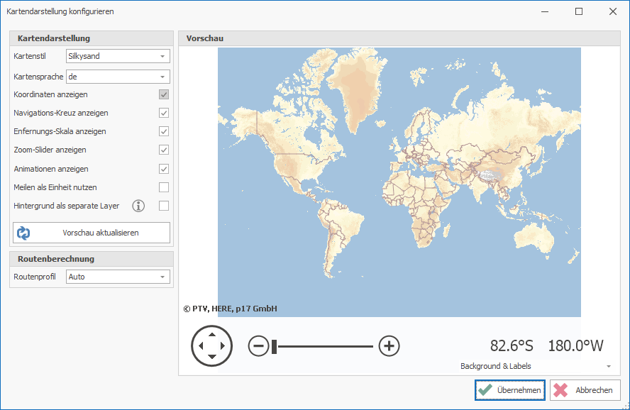 In diesem Dialogfenster kann zusätzlich noch die Konfiguration zur Berechnung der Route geändert werden. Dabei können Sie aus unterschiedlichen Routenprofilen auswählen. Im Standard wird die Routenberechnung mit einem Auto durchgeführt. Folgende Alternativen stehen zur Verfügung: