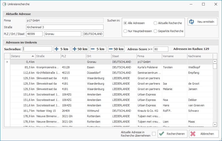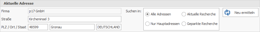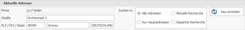 Im Bereich Aktuelle Adresse ist die ausgewählte Adresse hinterlegt. Außerdem kann hier eingestellt werden, ob in allen Adressen, nur in Hauptadressen, in der geparkten Recherche oder nur in der aktuellen Recherche gesucht wird. Wird diese Auswahl verändert, muss anschließend der Button Neu ermitteln geklickt werden, um die Adressen aus dem Umkreis zu aktualisieren.