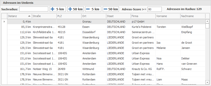 Im Bereich "Adressen im Umkreis" kann der Suchradius hinterlegt werden. Ist dieses Feld leer, können alle geokodierten Adressen recherchiert werden. Alternativ kann in das Textfeld ein Wert angegeben werden, bzw. über die Buttons +5km, +50km, -5km und -50km der Wert erhöht oder reduziert werden. Rechts daneben kann zusätzlich noch der Filter Adress-Score gesetzt werden. Hiermit werden nur die Adressen in der Recherche berücksichtigt, deren Adress-Score einen bestimmten Wert überschreitet. Falls die Adressen aus dem Suchradius herausrecherchiert werden sollen, muss das Dialogfenster über den Button Recherchieren verlassen werden.