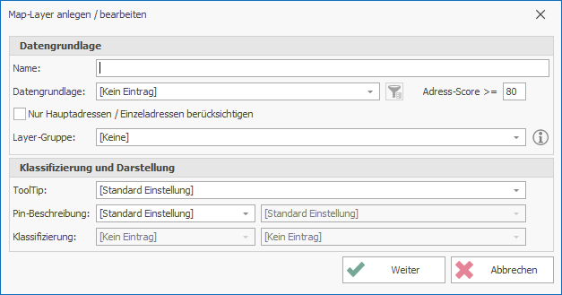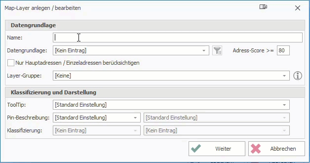 Nach dem Schließen des Dialogfensters über den Button Weiter öffnen sich die weiteren Einstellungen des Map-Layers.