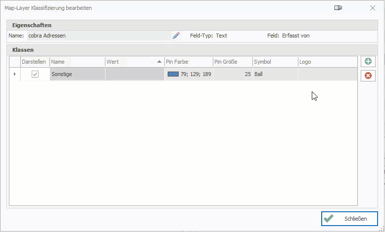Button können weitere Klassen hinzugefügt werden. Der darzustellende Wert kann im Dropdown-Feld auswählt werden. Für die Legende können Sie zusätzlich ein Name vergeben. Außerdem besteht die Möglichkeit das Symbol (Pin) von der Farbe, Form und Größe zu verändern.