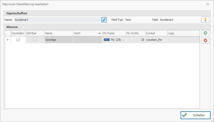Wenn in MAP+PLUS als Feld-Typ ein Textfeld ausgewählt wird, wird automatisch eine Gruppe Sonstige gebildet. Würden Sie das Dialogfenster über den Button Schließen verlassen und die digitale Landkarte aufrufen, würden alle Daten als 25 Pixel großer blauer Ball auf der digitalen Landkarte visualisiert werden.