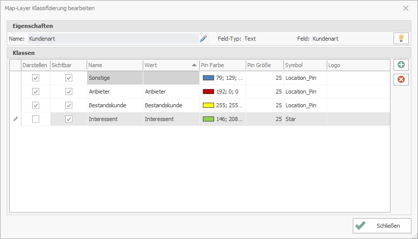 Alle Adressen mit dem Merkmal Anbieter werden als roter Ball dargestellt, alle Adressen mit dem Merkmal Bestandskunde als gelber Ball, alle Adressen mit dem Merkmal Interessent als grüner Stern. Alle anderen Adressen werden in diesem Fall in der Gruppe Sonstige zusammengefasst und als blauer Ball dargestellt.