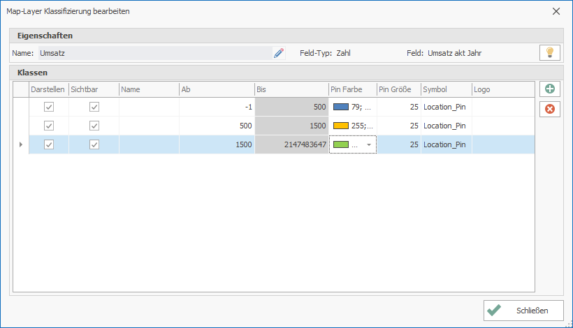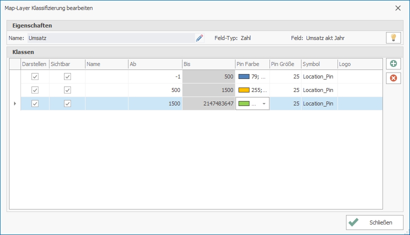 Die erste Klasse beinhaltet alle Adressen mit einem Umsatz zwischen -1 bis 500 Euro. Diese Adressen werden auf der digitalen Landkarte als roter Ball dargestellt. Die zweite Klasse beinhaltet alle Adressen mit einem Umsatz zwischen 500 bis 1.500 Euro. Diese Adressen werden auf der digitalen Landkarte als orangefarbener Ball dargestellt. Die dritte Klasse beinhaltet alle Adressen mit einem Umsatz zwischen 1.500 und 2004,24 Euro. Diese Adressen werden auf der digitalen Landkarte als grüner Ball dargestellt.
