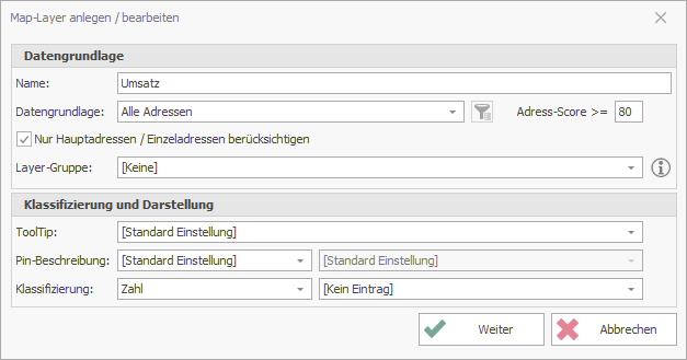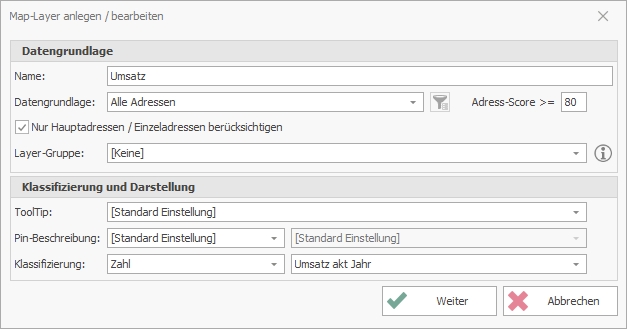 Sobald Sie das Fenster über den Button Weiter verlassen, gelangen Sie in die Einstellungen des Map-Layers.