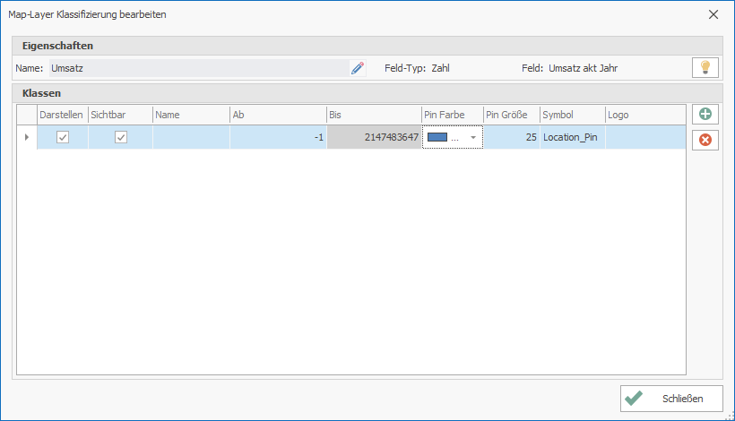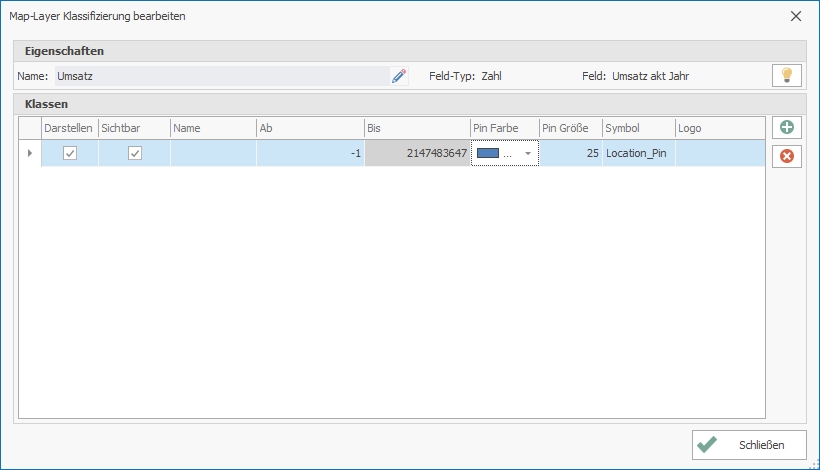 Wenn in MAP+PLUS als Feld-Typ ein Zahlenfeld ausgewählt wird, wird automatisch ein Wertebereich gebildet, der im Bereich ab den kleinsten Wert und im bis Bereich den größten Wert widerspiegelt. Verlassen Sie das Dialogfenster über den Button Schließen und rufen die digitale Landkarte auf, werden auf der digitalen Landkarte alle Daten als 25 Pixel großer blauer Ball visualisiert.